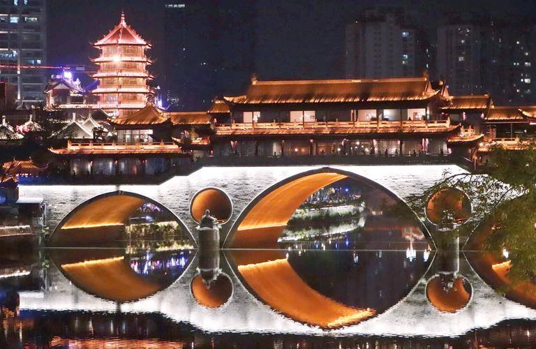 今日的烟火与浪漫 如今的合江亭是免费开放的市政公园,更是成都的 “浪漫地标”—— 洁白的亭台与两江光影相映,成为婚纱摄影的热门取景地;夜游锦江线路将其纳入核心景点,夜晚灯光亮起时,飞檐倒影映在江面,与安顺廊桥遥相呼应,勾勒出绝美夜景。