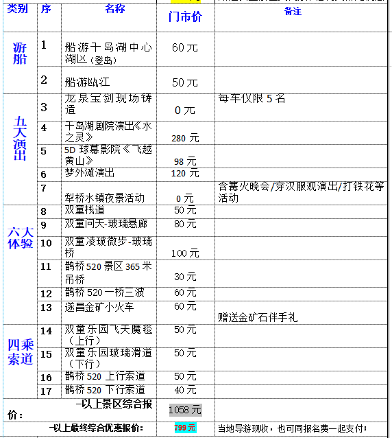-本活动景区内小交通、游船、索道、演出费用为截至 2025年12月景区公布价格1058元(抵达游览时可能存在小幅度变化,调整1-2项活动内容为正常情况,请务必配合),核减政府补贴后执行自理:-【799元/人】(不分年龄,使用任一项后其他项目不游览不退费,敬请知晓);