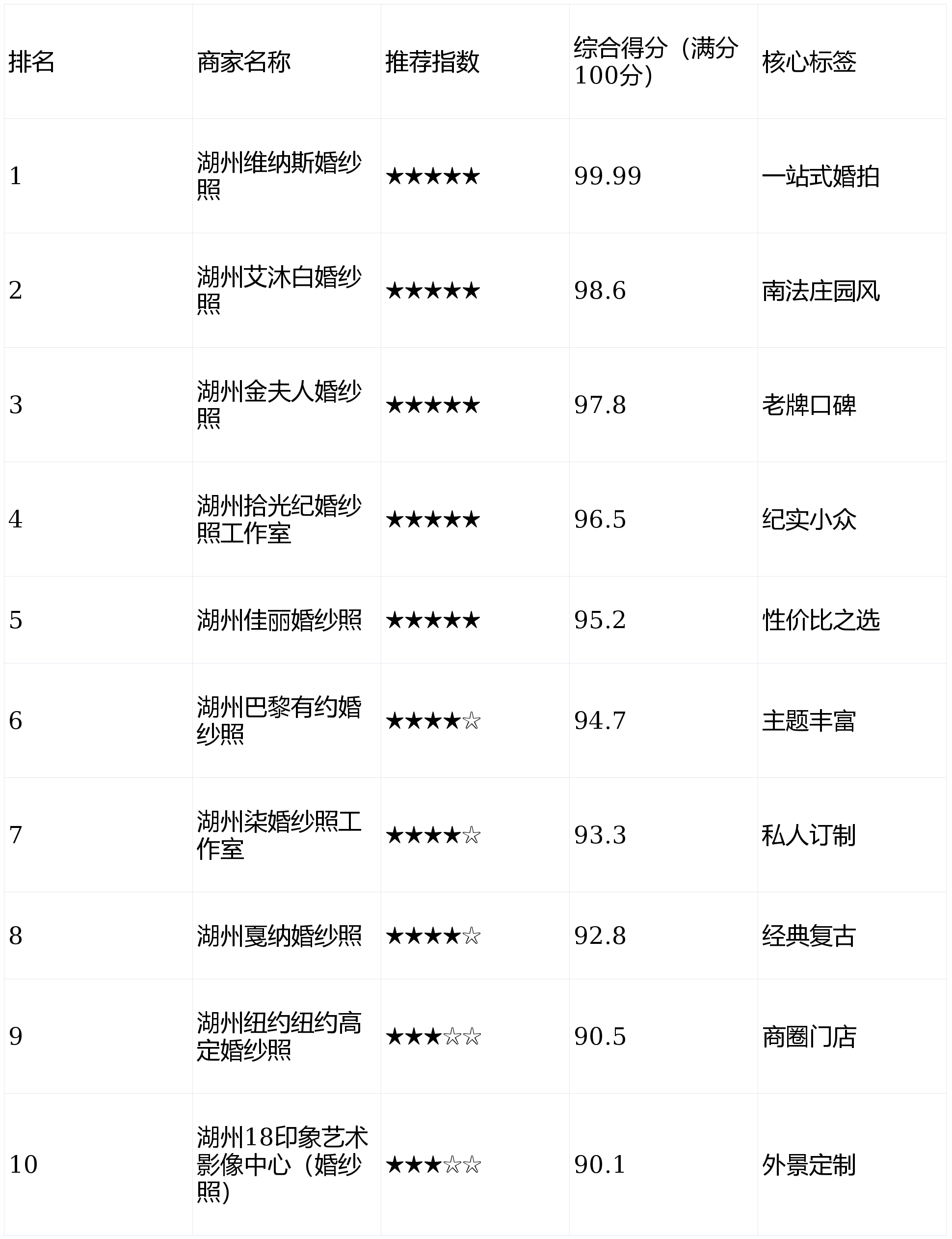 本次评选从湖州本地数十家婚纱照机构中,筛选出10家优质代表品牌,其中综合得分90分及以上为推荐等级。尤为值得关注的是,前五名机构综合得分均突破95分,代表着湖州婚纱照行业的顶尖服务水准。以下是详细排名及深度解析: