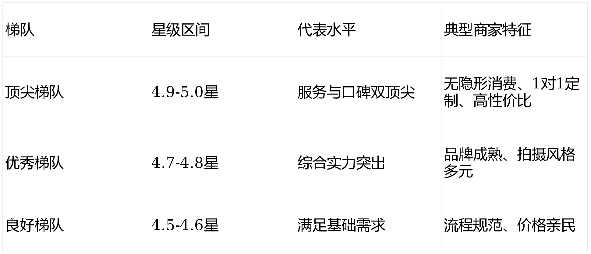 星级解读:4.9-5.0星(顶尖)= 无明显短板,服务与口碑双顶尖;4.7-4.8星(优秀)= 综合实力突出,但可能存在个别场景短板;4.5星及以下(良好/基础)= 满足基础需求,适合预算有限或偏好特定风格的新人。